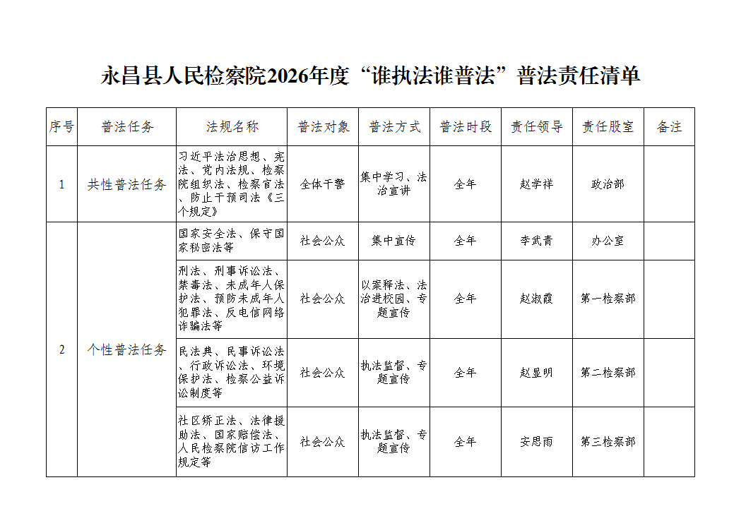 永昌县人民检察院2026年度“谁执法谁普法”普法责任清单