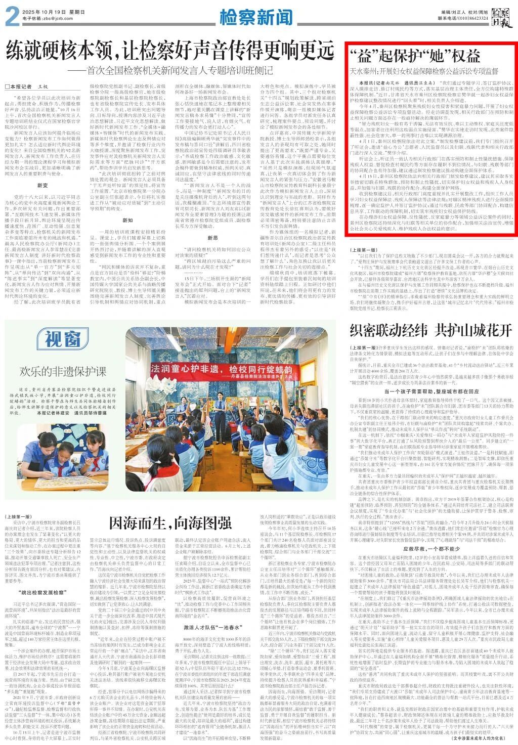 2025年10月19日,检察日报刊发《“益”起保护“她”权益 天水秦州:开展妇女权益保障检察公益诉讼专项监督》。